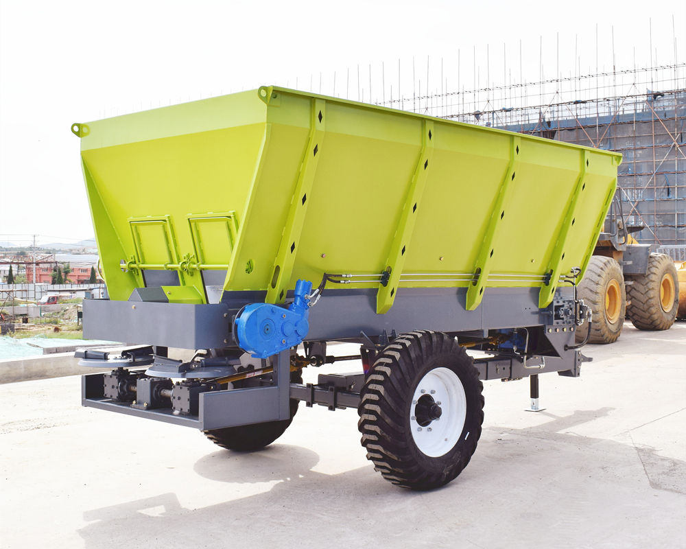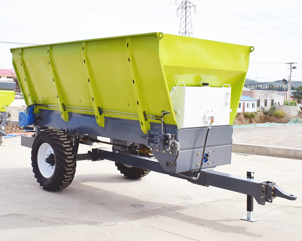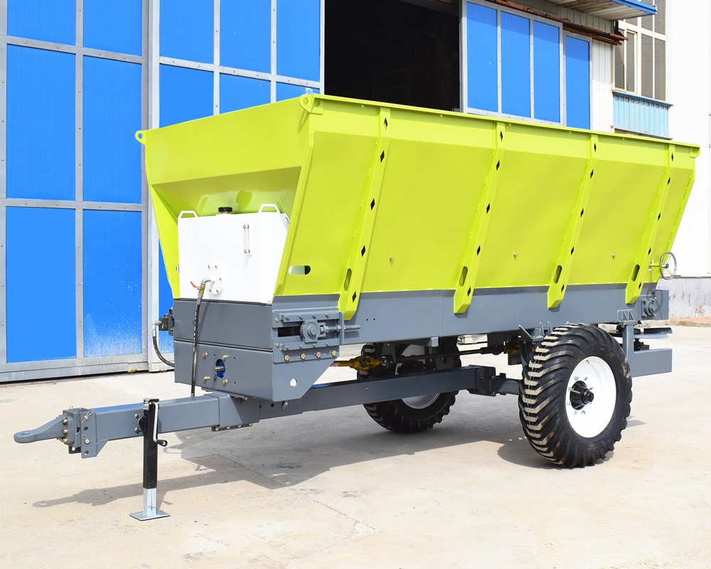 该撒肥机自带液压油箱,装载容积大小可定制,整机主要由牵引架、车架焊合、肥箱、液压油箱、液压系统、传动装置、送肥装置、撒肥装置、地轮机构等部件组成。该机以拖拉机后动力输出为动力,带动机身自带液压系统驱动液压马达工作,通过送肥装置向后输送肥料,后传动轴驱动齿轮箱,实现双撒肥盘旋转,从而实现肥料撒播。该系列撒肥机撒肥性能稳定,抛撒作业均匀,有效解决了肥料撒施成本高、撒施粗放、肥料浪费严重、有机肥还田难的问题。